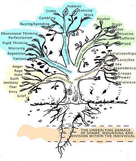 The branches of the tree represent various types of addictive behavior. The root cause is the hurts we keep concealed inside of us. Recovery requires realization that we are powerless to change our behavior by ourselves, but God can.